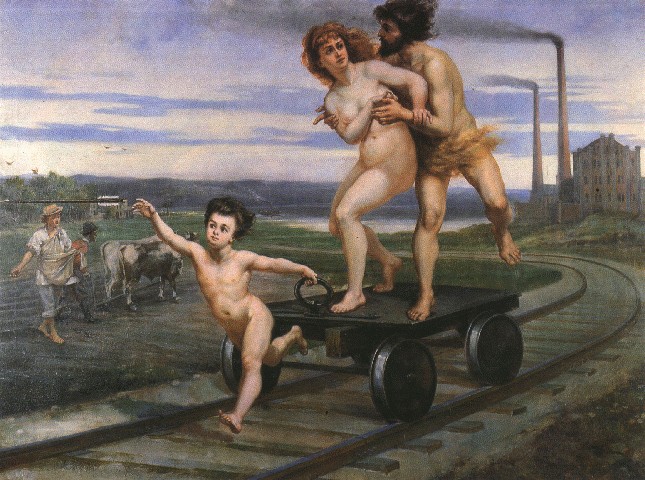 Центральные образы картины символизируют изобретение паровой машины и