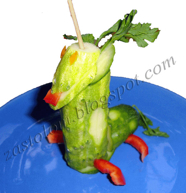 Вот такой дракончик получился у меня из огурца, перчика и петрушки. Голову я нацепила на туловище с помощью зубочистки.