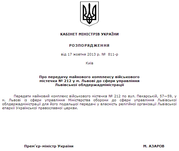 Майновий комплекс військового містечка №212, що розташоване у Львові на вулиці Пекарській, 57-59, передадуть Львівській ОДА, яку очолює Віктор Шемчук. Згідно із розпорядженням уряду, Львівська ОДА в свою чергу повинна передати комплекс у власність Львівської єпархії Української православної церкви.
