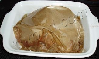 Мясо укутать пергаментной бумагой (влажной стороной внутрь), так, чтобы между мясом и бумагой оставался небольшой зазор, причем края бумаги (с запасом) должны лежать в форме.
