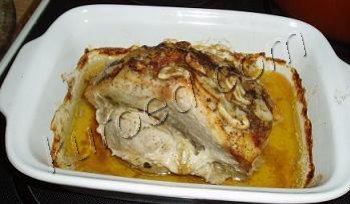 Точно таким же образом можно запечь и свиную грудинку, только воды в форму наливать меньше - на 1-2 пальца.