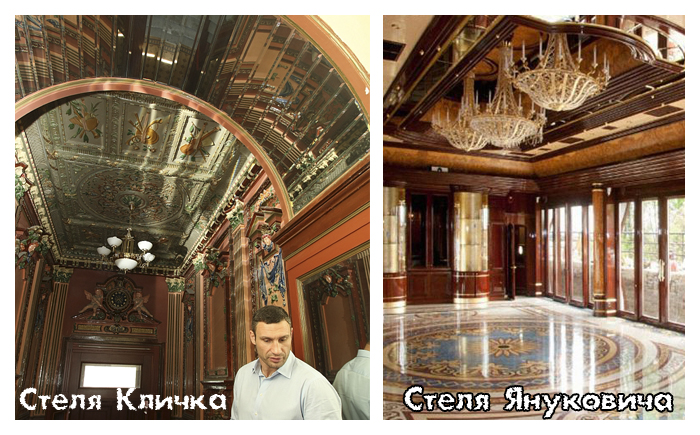 Зверніть увагу на стелі та оздоблення їхнього житла. Це в якійсь мірі є відображенням внутрішнього світу цих персонажів. Це жахливий кітч, навіть не сибаритів, а примітивних нуворишів, Екстравагантність, крикливість елементів, їхня вульгарність, свідчать про те, що ці люди хочуть досягнути статусу культурної еліти, якій вони заздрять, і якою ніколи не будуть, шляхом наслідування зовнішніх рис їх культурних звичаїв. Єдине, що поки що розрізняє Кличка та Януковича, це розміри їхнього житла та висота стелі. У Януковича зараз нема ніяких обмежень ні в розмірах, ні у висоті. Кличко у своїх примітивних фантазіях затиснутий в межі міської квартири. І тут неважливо, що Янукович все це ваяє на крадені гроші, а Кличко на зароблені на мордобої. Важливо, як вони використовують їх. Можна красиво, зі смаком облаштувати свій побут, приміщення в якому мешкаєш, і тоді коли обмежений в грошах, і коли є їх надлишок. Але коли нема ні смаку, ні естетичного відчуття,  коли слово "культура" сприймається. як лайливий вислів, то тоді і виникають ось такі об'єкти низькопробного виробництва.