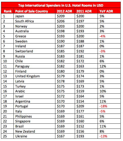 Портал Hotels.com склав щорічне дослідження цін у готелях світу The Hotel Price Index. За підсумками 2012 року українці на 13% менше витратили в готелях США - $167 за ніч. Таким чином опинилися серед 25 країн-лідерів, які є прибутковими клієнтами американського готельного бізнесу. У 2011 році наші співвітчизники ділили з австралійцями 6-7 сходинки з середніми витратами у $193 за проведену ніч.