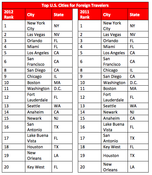 Серед іноземних туристів особливою увагою користується Нью-Йорк, Лас-Вегас, два сонячнх міста з Флоріди (Орландо і Майямі), Каліфорнія (Лос-Анджелес. Сан-Франциско, Сан-Дієно). Першу десятку замикають Бостон і Вашингтон.