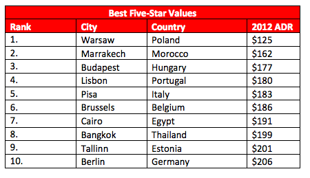 За посказника “найкраза ціна для п'ятизіркового готелю” лідирують готелі міст з колишнього радянського табору — Варшава, Будапешт і Таллінн.