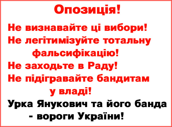 В решті-решт, Ви хоч себе поважайте. По суті, опозиція виграла ці вибори. Але цю перемогу, зграя покидьків у владі, вкрала у Вас. Вкрала під час підготовки до виборів, під час голосування, та продовжує красти і зараз. Підпалюються дільниці, "Беркут" вдирається у приміщення ОВК та краде бюлетені. Самі ОВК без вказівок з лігва упиря Януковича, ніяких рішень не приймають. Біля комп'терів сидять якісь ідіоти, що не можуть вірно внести дві цифри в протоколи, але при цьому, в усіх таких випадках послідовно зменшують голоси, віддані за опозиційного кандидата у депутати та збільшують голоси пробандитського кандидати. Все це робиться на Ваших очах, на наших очах, на очах у всього світу. Яке може бути визнання таких псевдовиборів?