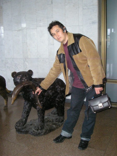На фотографии Ваш покорный слуга пытается забрать рыбу у железного медведа в аэропорту "Минск-2". Но вы никому не говорите, что я такой. А я, если что, могу сказать, что я на снимке слева - кто ж потом докажет?