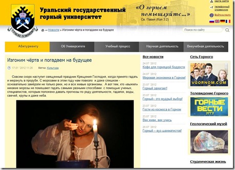 На официальном сайте Уральского государственного горного университета размещена инструкция по изгнанию нечистой силы и предсказанию будущего. В материале под названием«Изгоним чёрта и погадаем на будущее» рассказывается о том, как нужно гадать в святочную неделю и что делать, чтобы предсказания сбылись. Особое внимание университетский сайт уделяет избавлению от нечистой силы. Так, для того, чтобы изгнать чёрта, УГГУ советует «вывернуть свою любимую шубу наизнанку, раздобыть кочергу и с полчаса скакать вокруг незнакомого мужика в чёрном тулупе, но, говорят, оно того стоит».