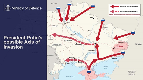 Найбільш масовані наземні атаки, судячи з карти, припадуть по Києву та Дніпру. Сам напад на карті поділено на дві фази.У Міністерстві оборони Великобританії у четвер, 17 лютого, опублікували карту, на якій позначено можливі маршрути російської армії у разі вторгнення в Україну.