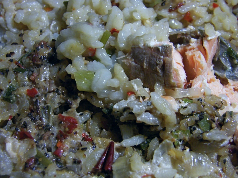 И еще в тему. Довольно неплохой рис в Сильпо сегодня был. На ужин намечался лосось в луково-рисовой замазке с мускатным орехом, перцем и кориандром. Он получися. Тем более, что все это было на чистейшей курином бульоне.