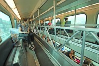 Лестницы на второй этаж находятся справа и слева при входе в вагон.