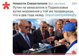 День сурка: Тот же самый президент России, покупает тоже самое мороженое. на том же самом авиасалоне, у той же самой продавщицы. Платит той же купюрой в 5000 руб и снова не берет сдачу.А вдруг оно с "начинкой"