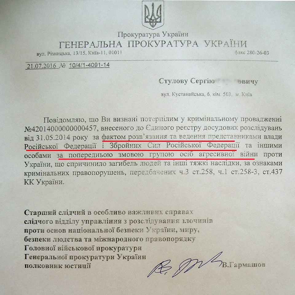 В ГПУ уже открыто уголовное производство №42014000000000457, внесенного в Единый реестр от 31.05.2014р. (По факту решения и ведения представителями РФ и Вооруженных Сил РФ и другими лицами по предварительному сговору группой лиц агрессивной войны против Украины, что повлекло гибель людей и другие тяжкие последствия, по признакам уголовных преступлений, предусмотренных ч.3 ст. 258, ч .1 ст. 258-3, ст. 437 УК Украины). Именно к этому производству правозащитники призывают переселенцев "присоединяться" и на основании него оформлять статус потерпевшего. Такой способ является наиболее простым и удобным.