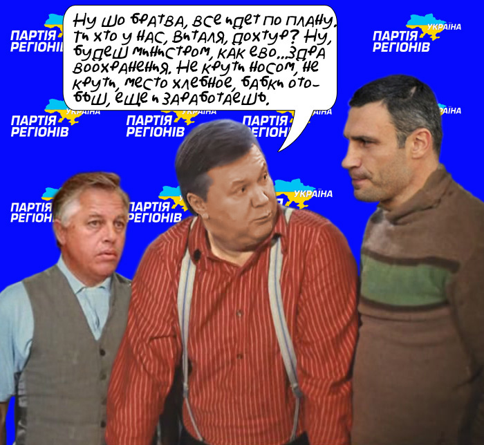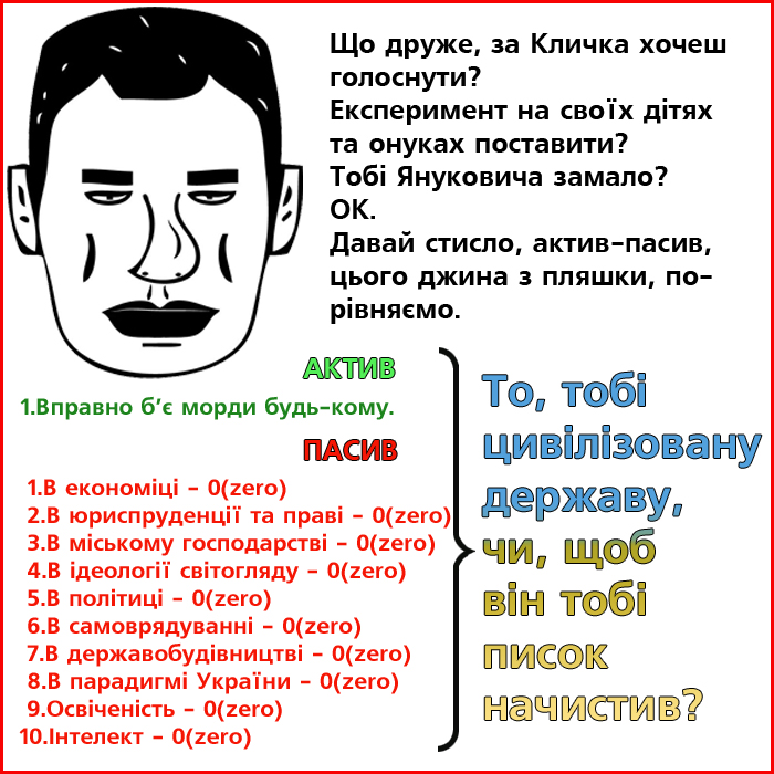 Але у нас дивна країна. В нас є такий екземпляр, який не розуміє цього. Це Кличко. На анімашці не його череп, і тим більше, не його мізки. Там тільки його образ. Я би не згадував, що його багато разів били по голові, в решті-решт, є політики, які займалися в свій час боксом, а потім кинули його та перейшли в політику. Але і тоді вони не купували партії, вони починали з самих азів. Проходили всі щаблі становлення політика. Від рядового члена партії, посад чиновника, дрібних виборних посад, і так далі, поступово вибудовуючи свою кар'єру.