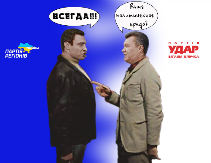 Звісно для цього повинні бути мізки. Хоч би таки, як на анімашці. А у Кличка, хто-небудь спостерігав наявність мізків? Можливо вони і є, але десь розміром з горіх. Освіти в нього нема ніякої (так само, як і партію, куплену ступень якого-то доктора, ми мабуть не будемо згадувати, чи не так?). Двох слів зв'язати він не може. Це який-то клон межигірського бовдура Януковича. До речі він повністю повторює його шлях. Не тільки за кругозором та освіченістю, вірніше, відсутністю і першого і другого. Але Кличка так само оберігають від запитань, як і Януковича. Щоб не дай Боже, хтось не спитав щось, не те що незручне, а просто за якусь банальну річ, з відповіддю на яку він просто зганьбився би. Прикладів тому вже чимало, тому його політтехнологи зробили висновки, і тепер фільтрують всі запитання, які надходять до нього на зустрічах з виборцями та прес-конференціях.