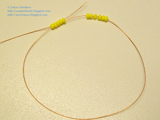 Далее набираем на один из концов проволоки 2 жёлтые бисеринки