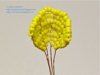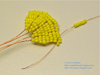 Затягиваем проволоку и размещаем получившийся рад бисеринок сверху от предыдущих жёлтых бисеринок.