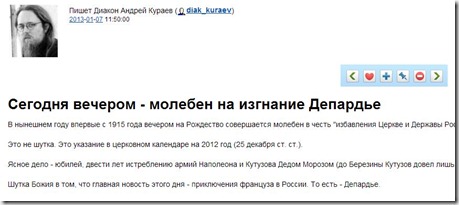 «Это не шутка. Это указание в церковном календаре на 2012 год (25 декабря ст. ст.). Ясное дело - юбилей, двести лет истреблению армий Наполеона и Кутузова Дедом Морозом (до Березины Кутузов довел лишь 40 000 из 120 000, что были у него в Тарутино. Шутка Божия в том, что главная новость этого дня – приключения француза в России. То есть – Депардье», - пишет Кураев.