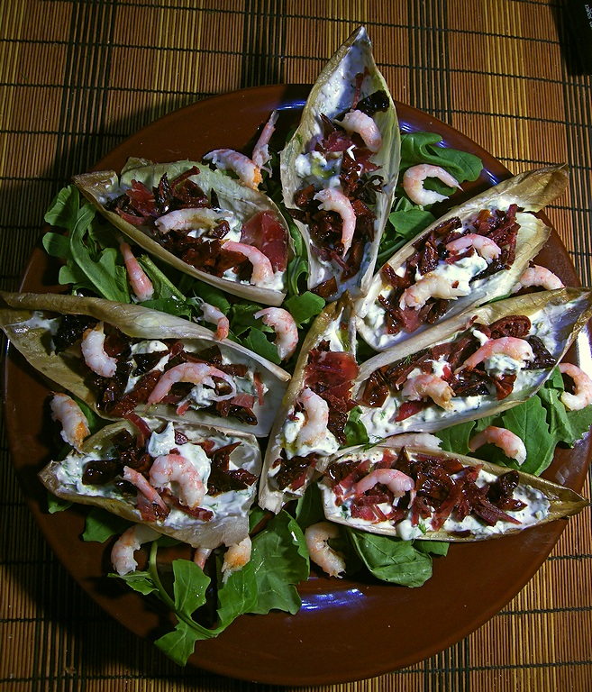 Разобранные лодочки цикория пару минут обдать паром, потом хорошенько наполнить смесью из обезжиренного йогурта, зелени, чеснока и тертой брынзы. Смесь можно досолить и поперчить. Намазанные лодочки посыпать мелко нарезанными вялеными помидорами и стружками бастурмы. Потом усадить в лодочки креветок и сбрызнуть нерафинированнным оливковым маслом. Это такое, которое мутное и с осадком. Фото прилагается. Очень вкусно.