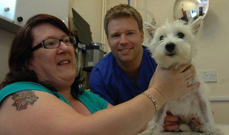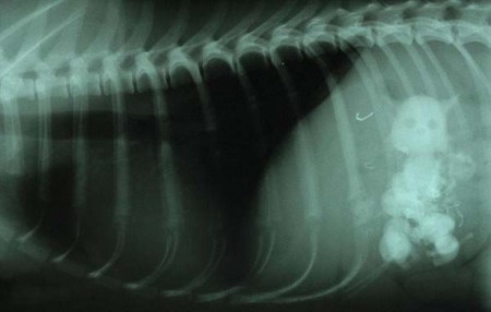 Владелец собаки, Саманта Рид, привезла его к ветеринару после того, как он начал отказываться от еды. Как показал рентген в желудке у собаки были 5 керамических изделий в виде котов. Самого большого кота (5 см) вы можете увидеть на снимке (между ребер Cнежка). Хозяйка была в шоке, когда врач сказал ей, что ее собака съела 5 кошек. Она думала, что они реальные.